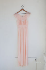 A vintage bias cut pale pink slip dress with a sheer micro pleated ruffled neckline. Tagged size 36. Acetate and rayon blend.
