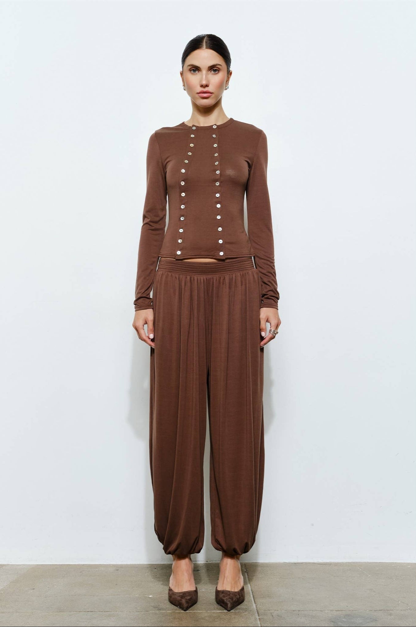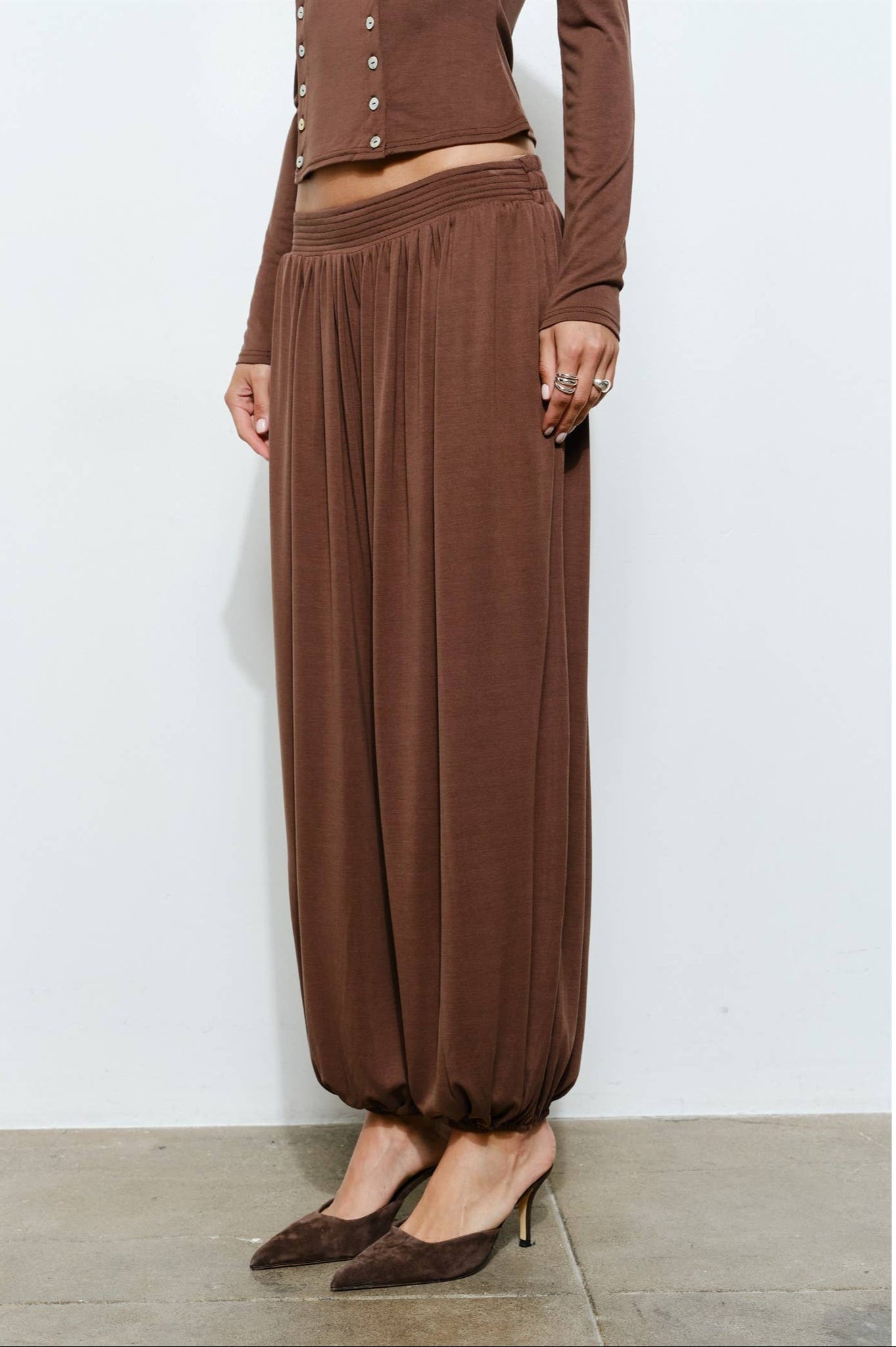 The Cassia pant combines ultimate comfort with a sophisticated silhouette, featuring a wide, comfortable waistband and a voluminous balloon leg that tapers at the ankle. Crafted from a luxuriously soft and fluid jersey for an elegant drape.