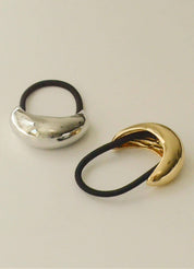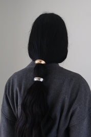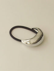 This hair tie features a unique narrow crescent shape with a smooth, polished finish. The eye-catching metal cuff adds a modern touch of sophistication to any hairstyle.