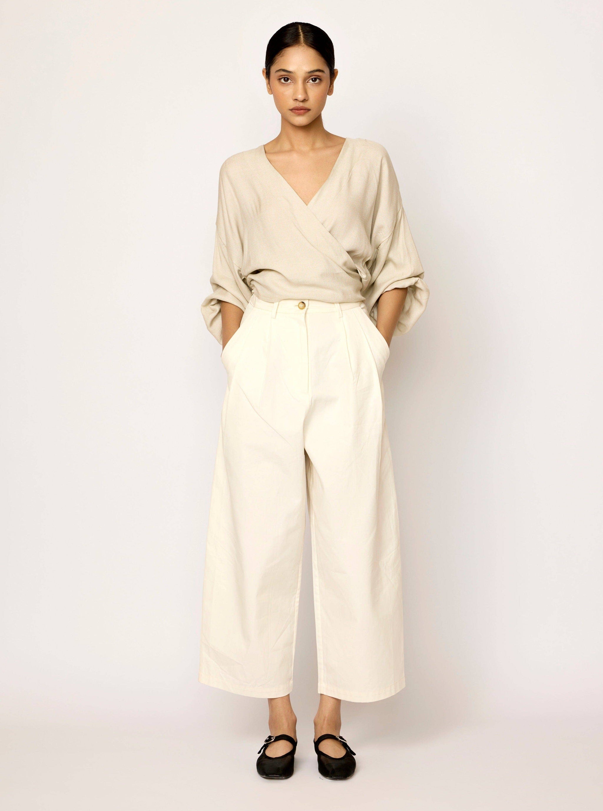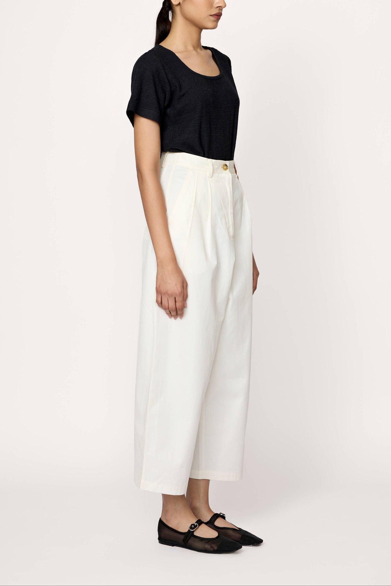 Ivory boyfriend pants in organic cotton twill. Features a pleated front, tailored waistband, side pockets, and zip closure. Clean lines, comfortable fit, versatile styling.