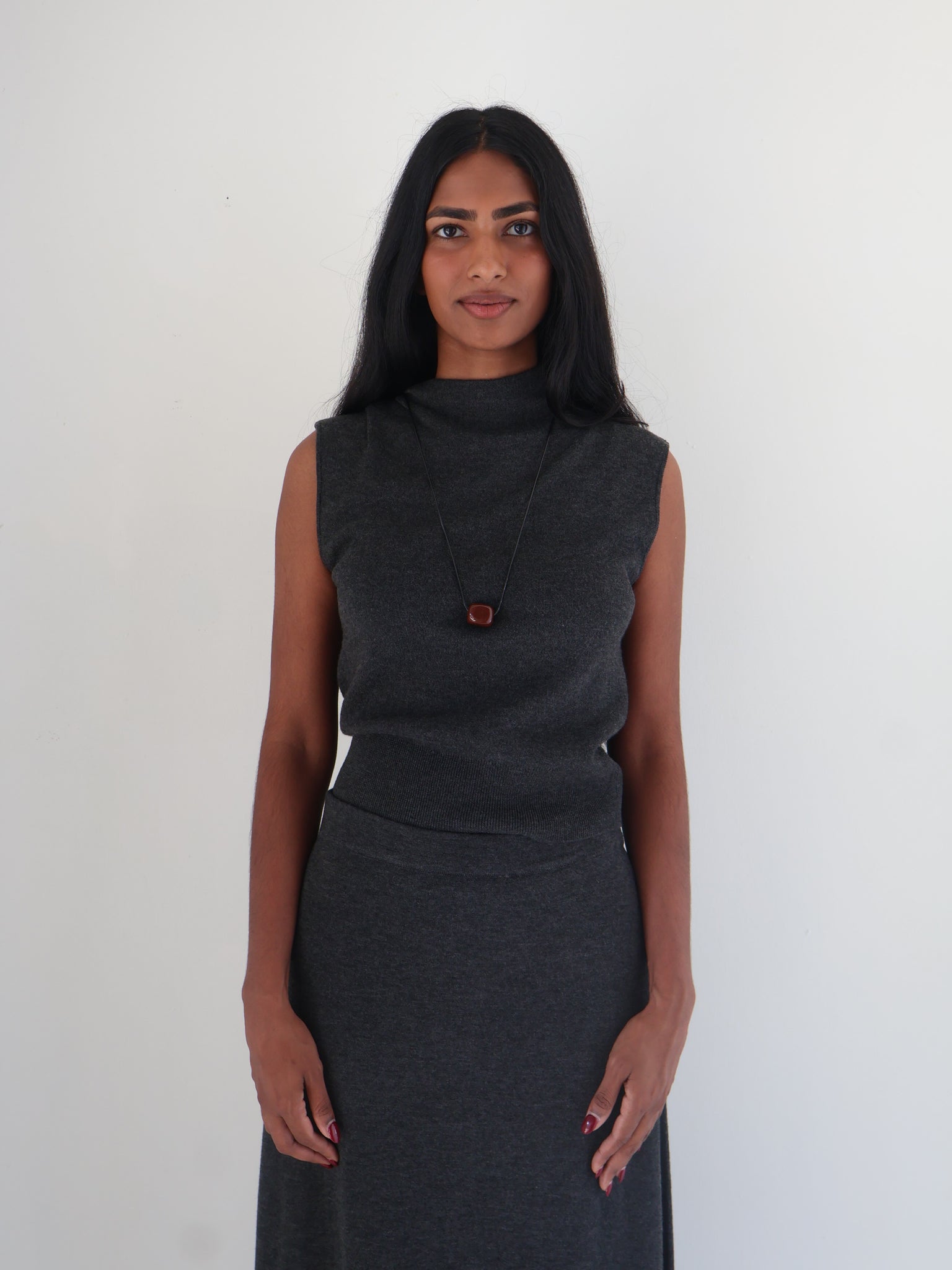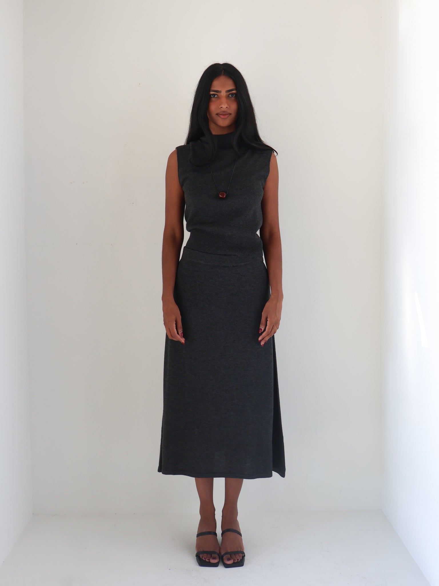 This sleeveless sweater is a functional piece that pairs well with jeans for casual looks and can be dressed up when worn with its coordinating midi skirt.