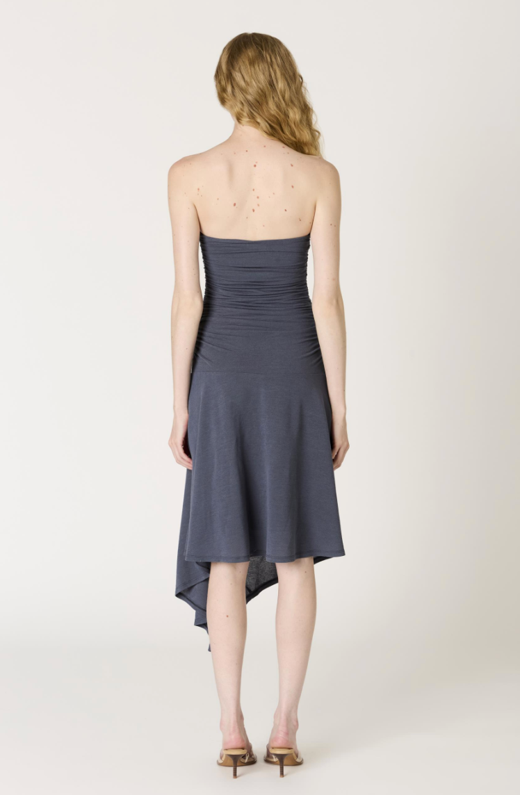 Beautiful indigo blue strapless midi dress with asymmetrical handkerchief hemline and gathered sides for a flattering fit.