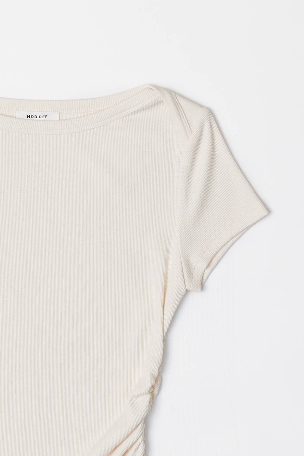 Cropped babydoll silhouette with an architectural overwrapped shoulder—the Elaina is your new closet essential. Rib knit construction, boat neckline, and waist ruching create effortless dimension. Layer it, tuck it, wear it endlessly.
