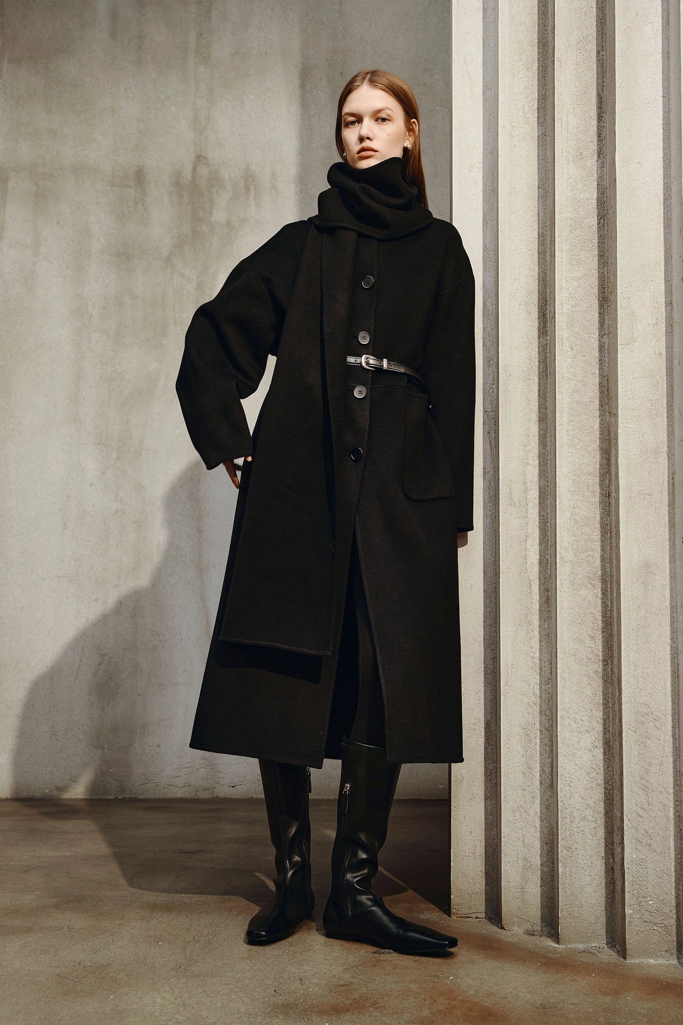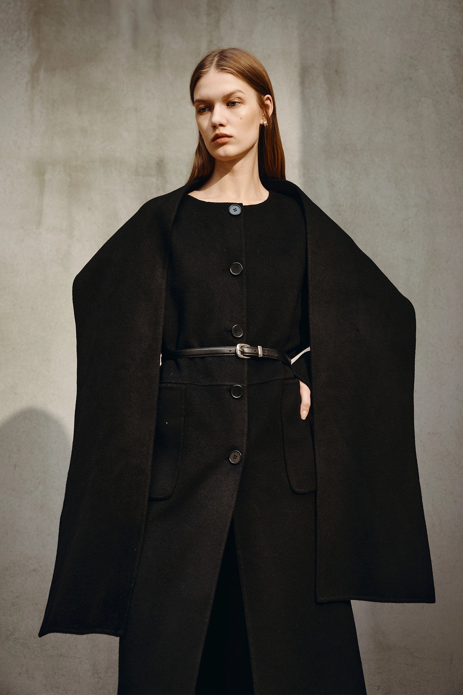 Wool-cashmere handmade coat with integrated scarf detail, crafted for clean drape, light warmth, and sophisticated seasonal layering.