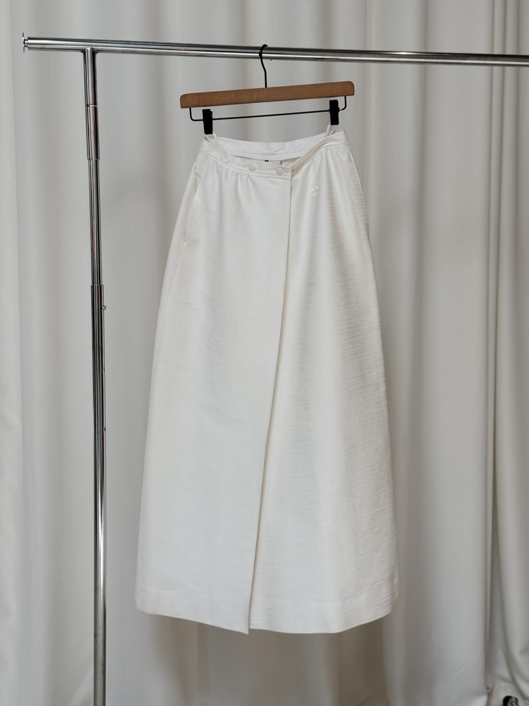 Vintage white wrap midi skirt featuring a structured A-line silhouette and snap button front closure. A timeless neutral piece with subtle texture and embroidered logo. Perfect for minimalist capsule wardrobe.