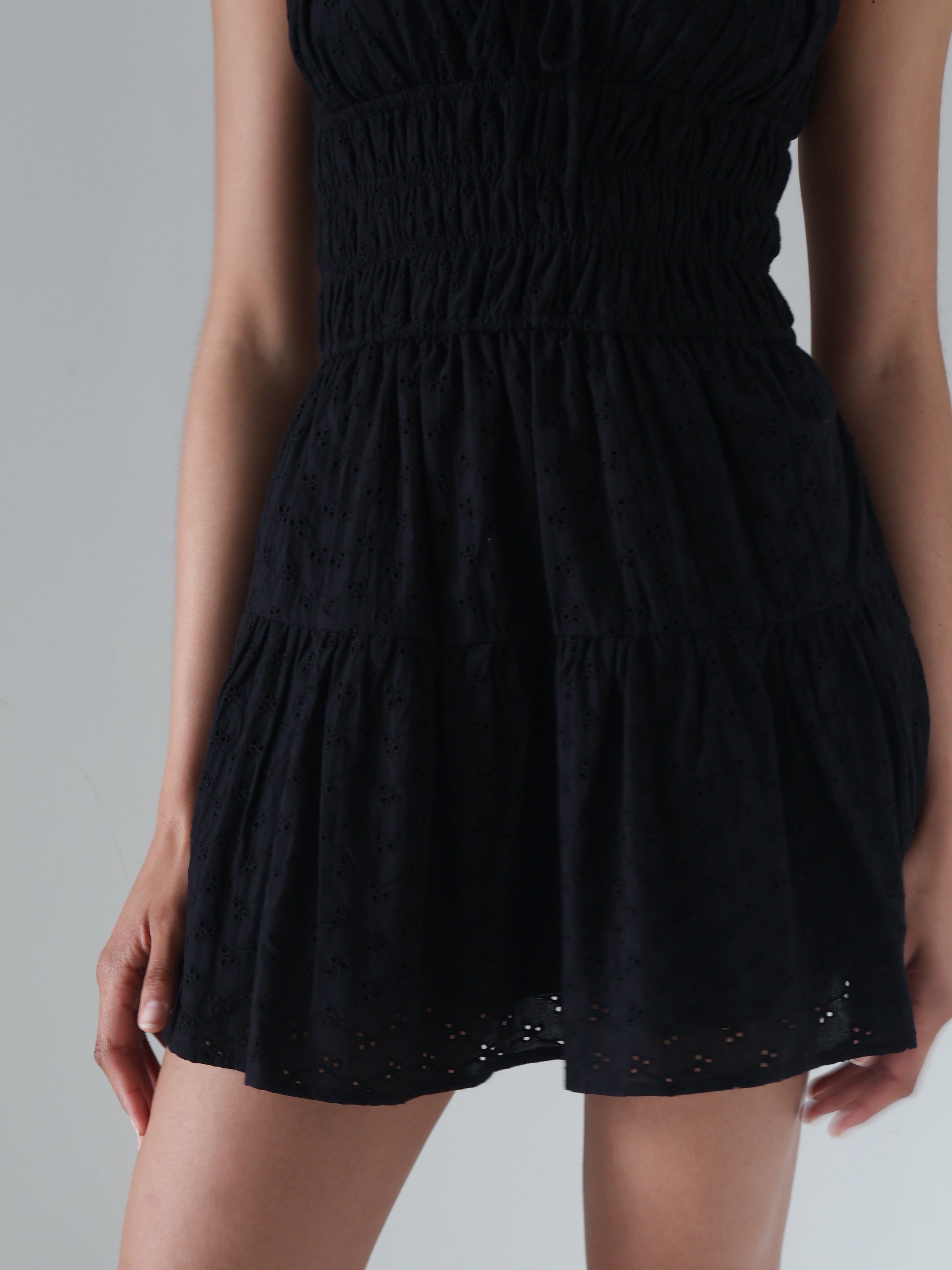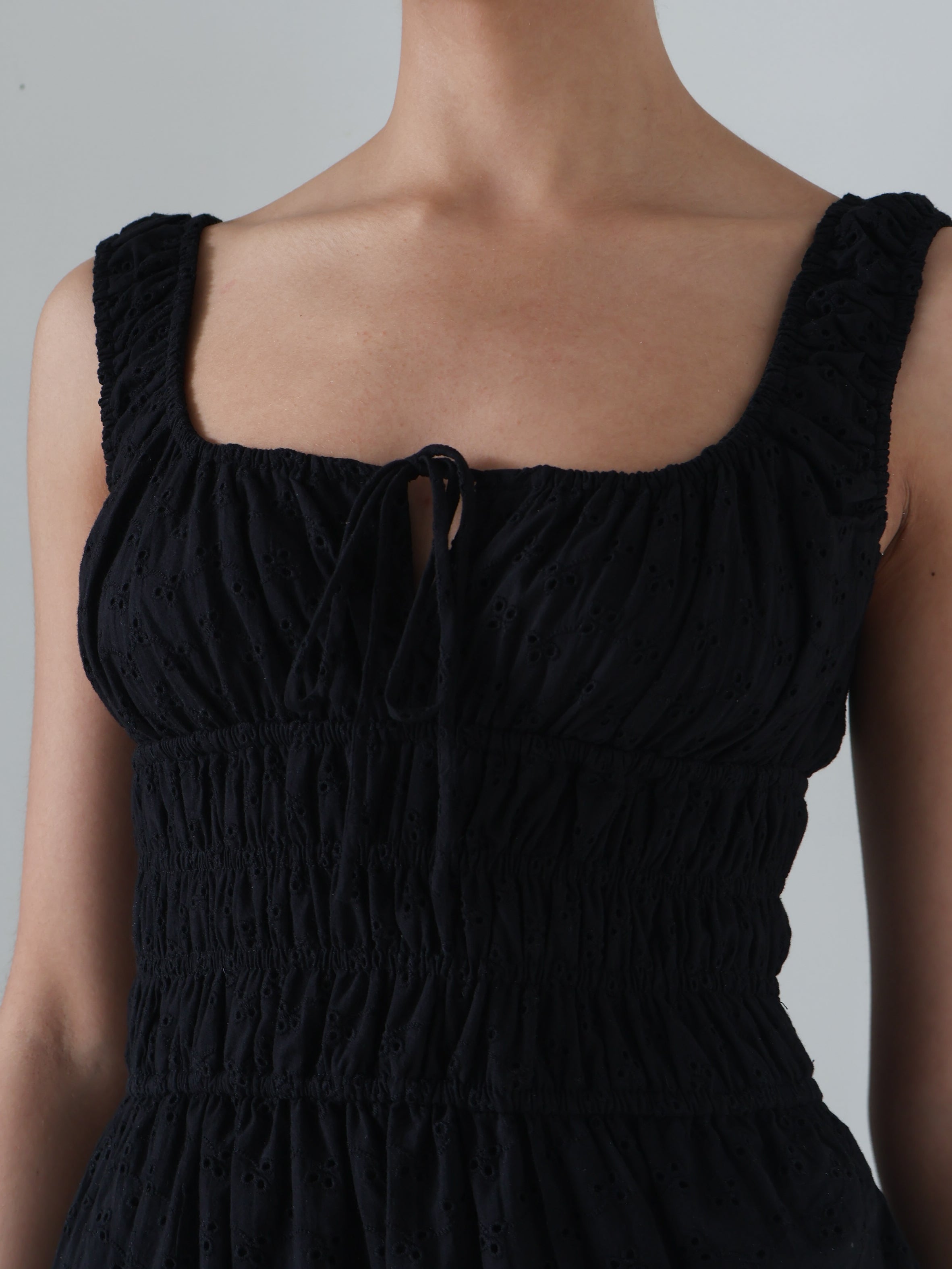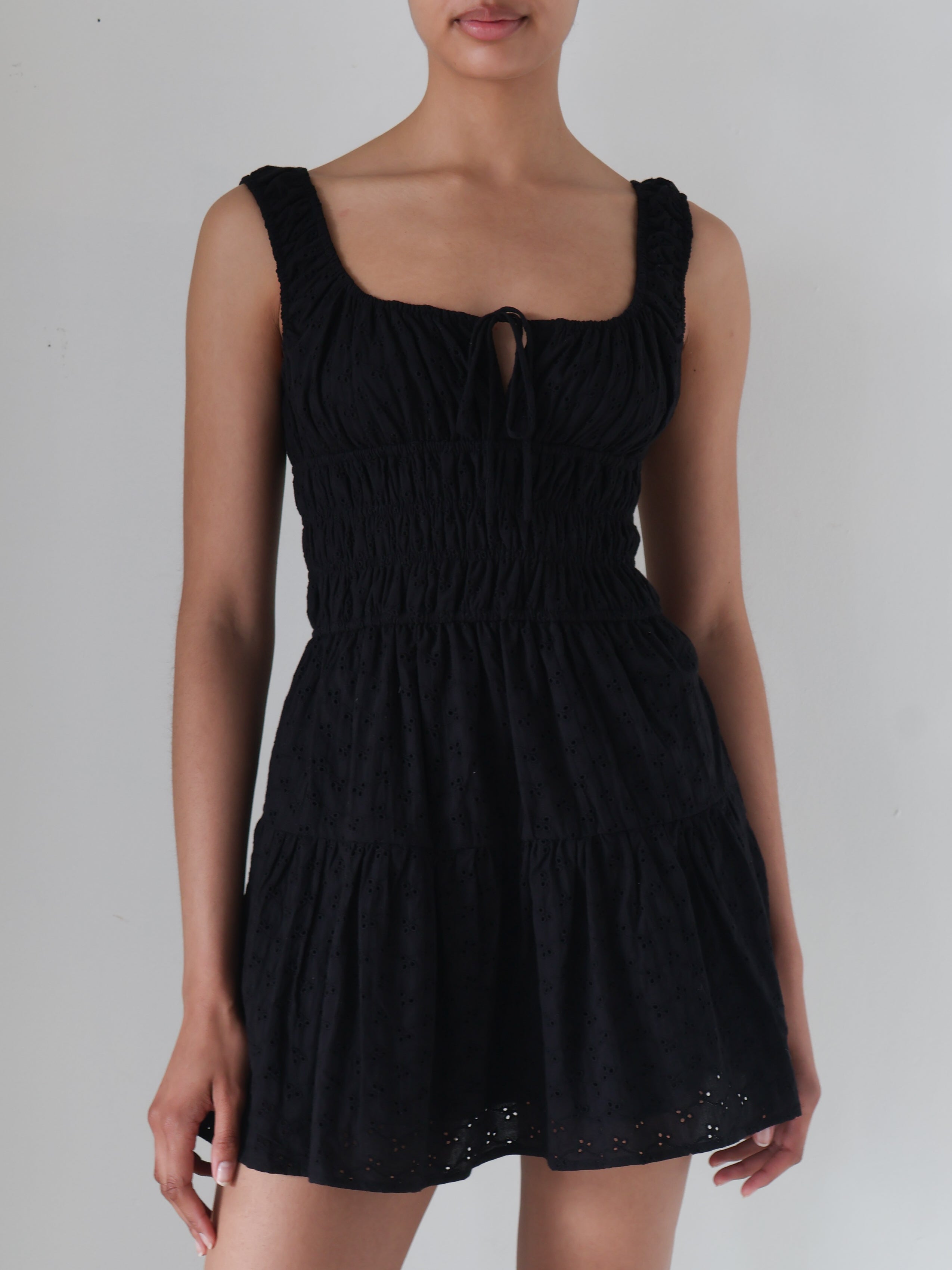 The Salt Dress channels a blend of nostalgic charm and playful ease. This warm-weather muse features a ruched bodice with a flattering scoop neckline and front-tie detail. The skirt flows into a flouncy, tiered silhouette that moves with ease.