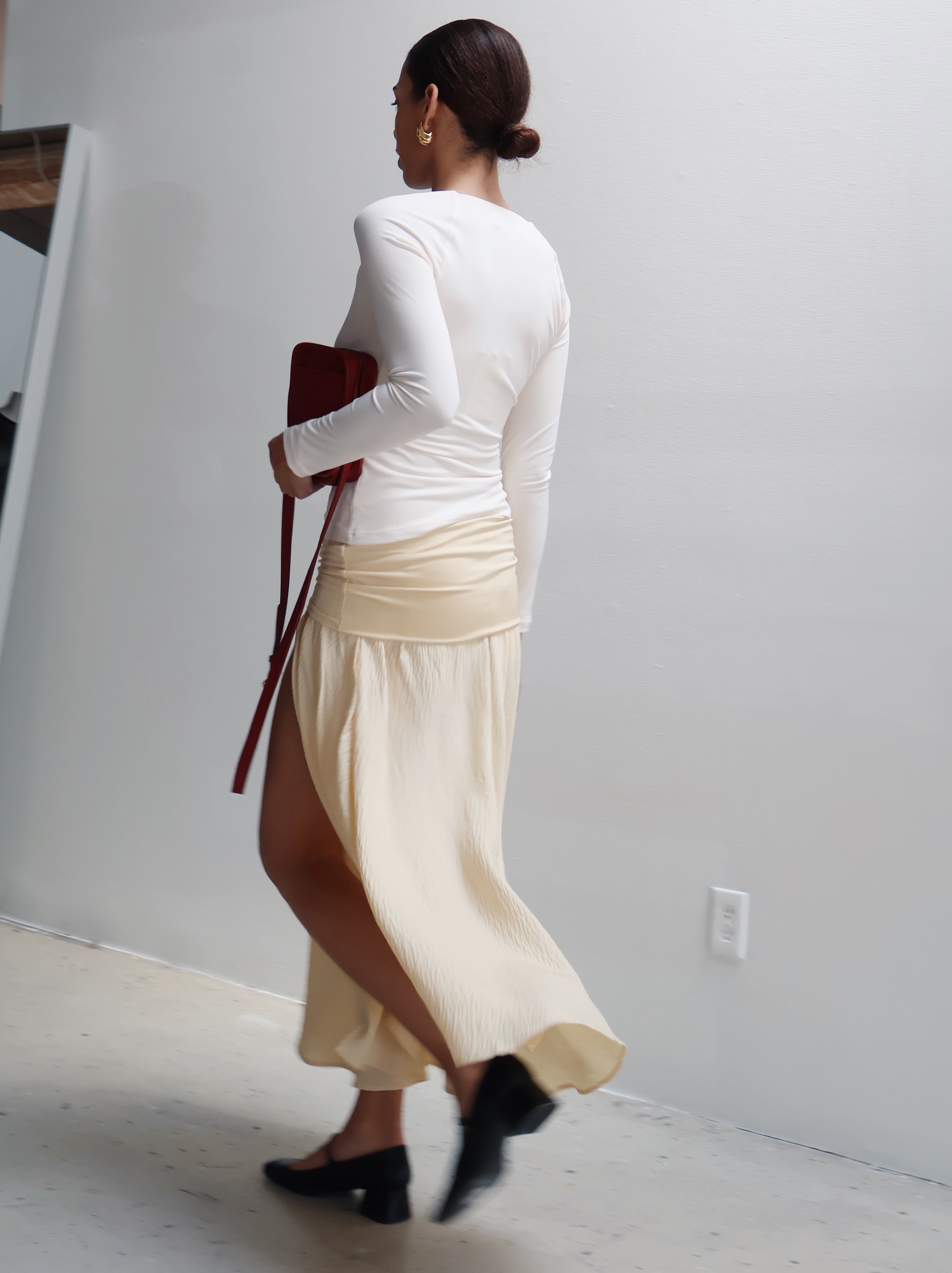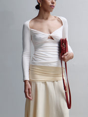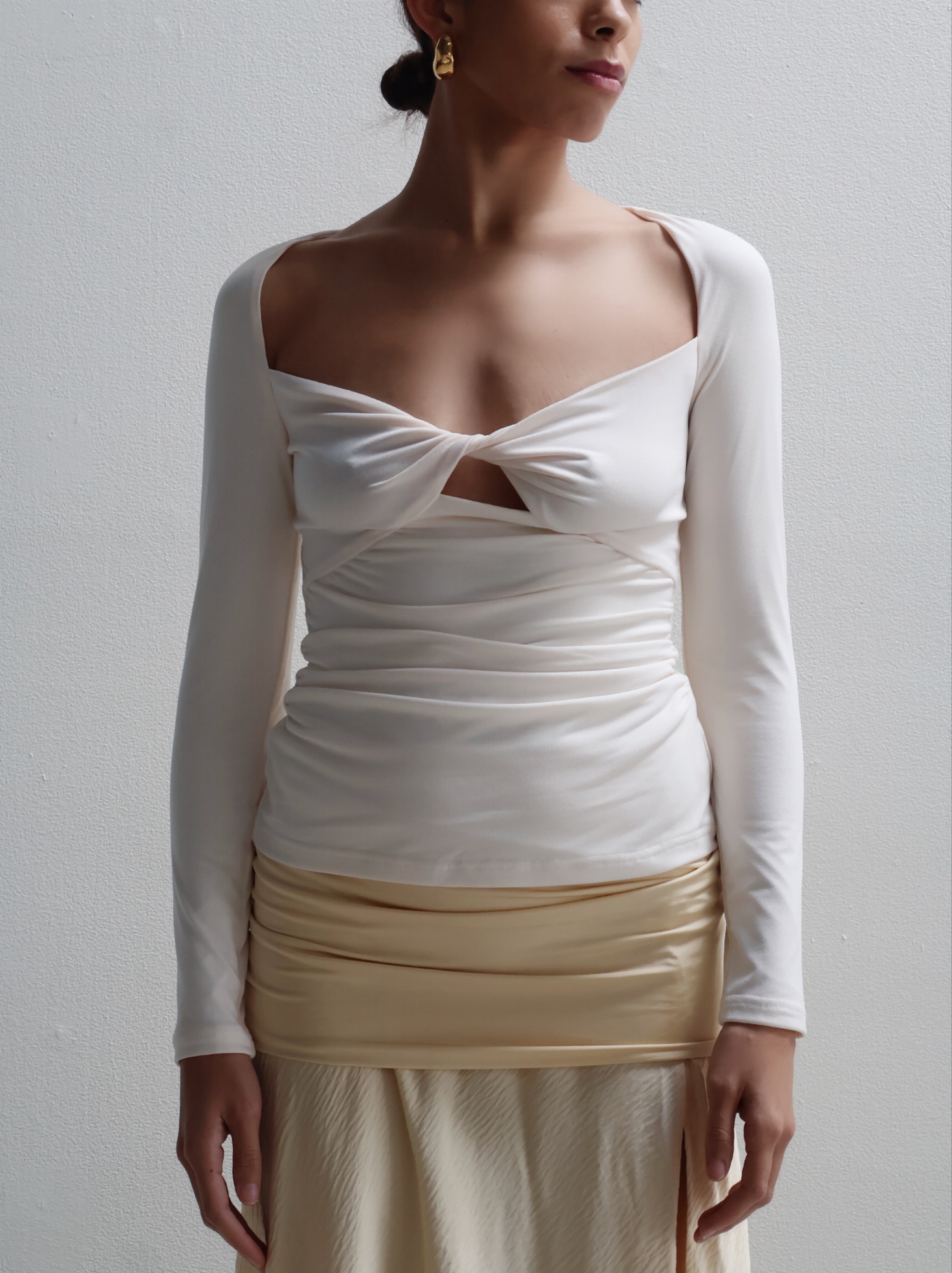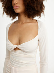 A transitional hero piece ~ the Posie Long Sleeve Top in Cream flatters the feminine form. Crafted from our luxurious crepe jersey fabrication, featuring full length sleeves, open neckline, twist detail at the bust and subtle cut out.