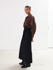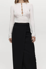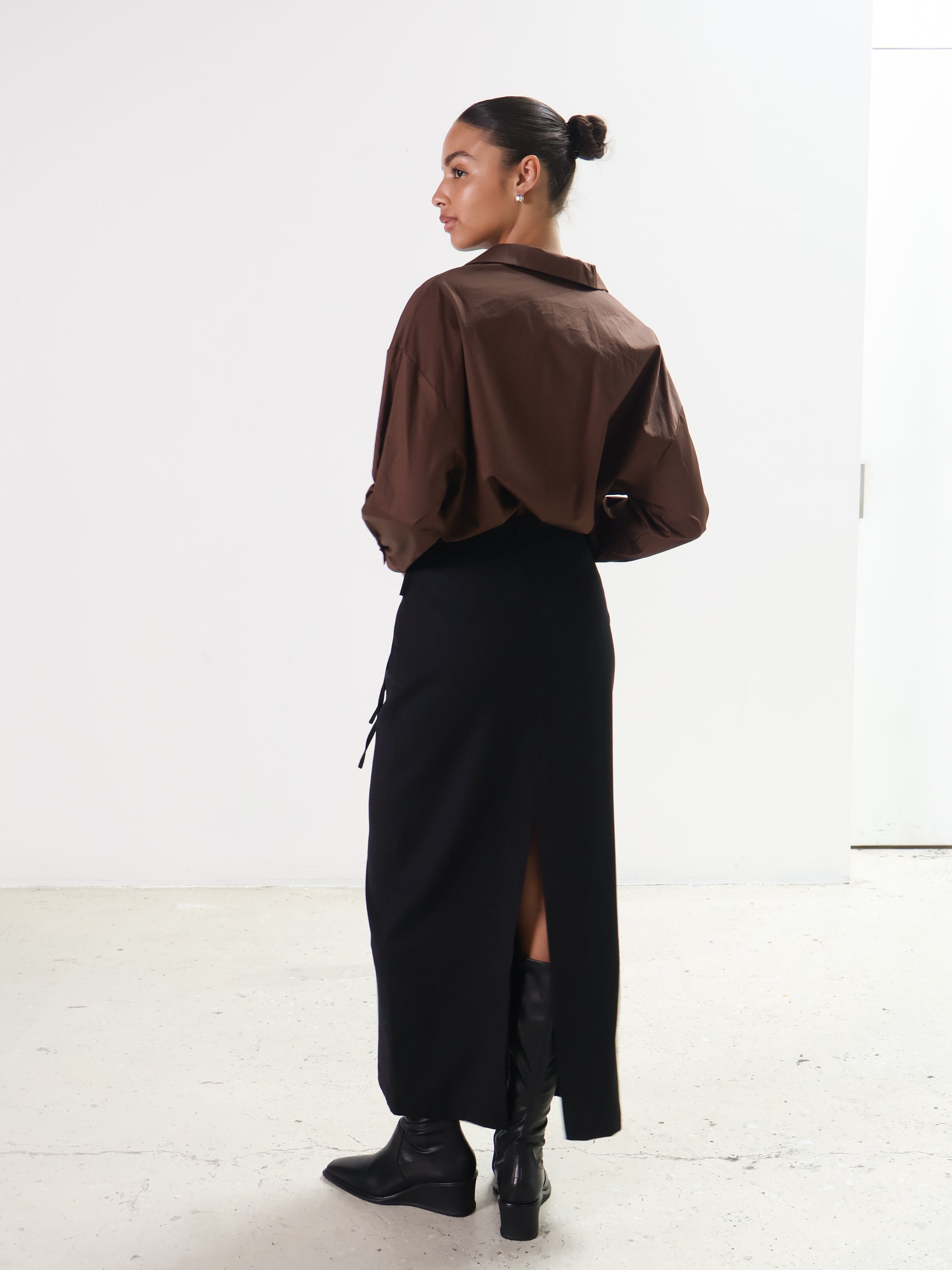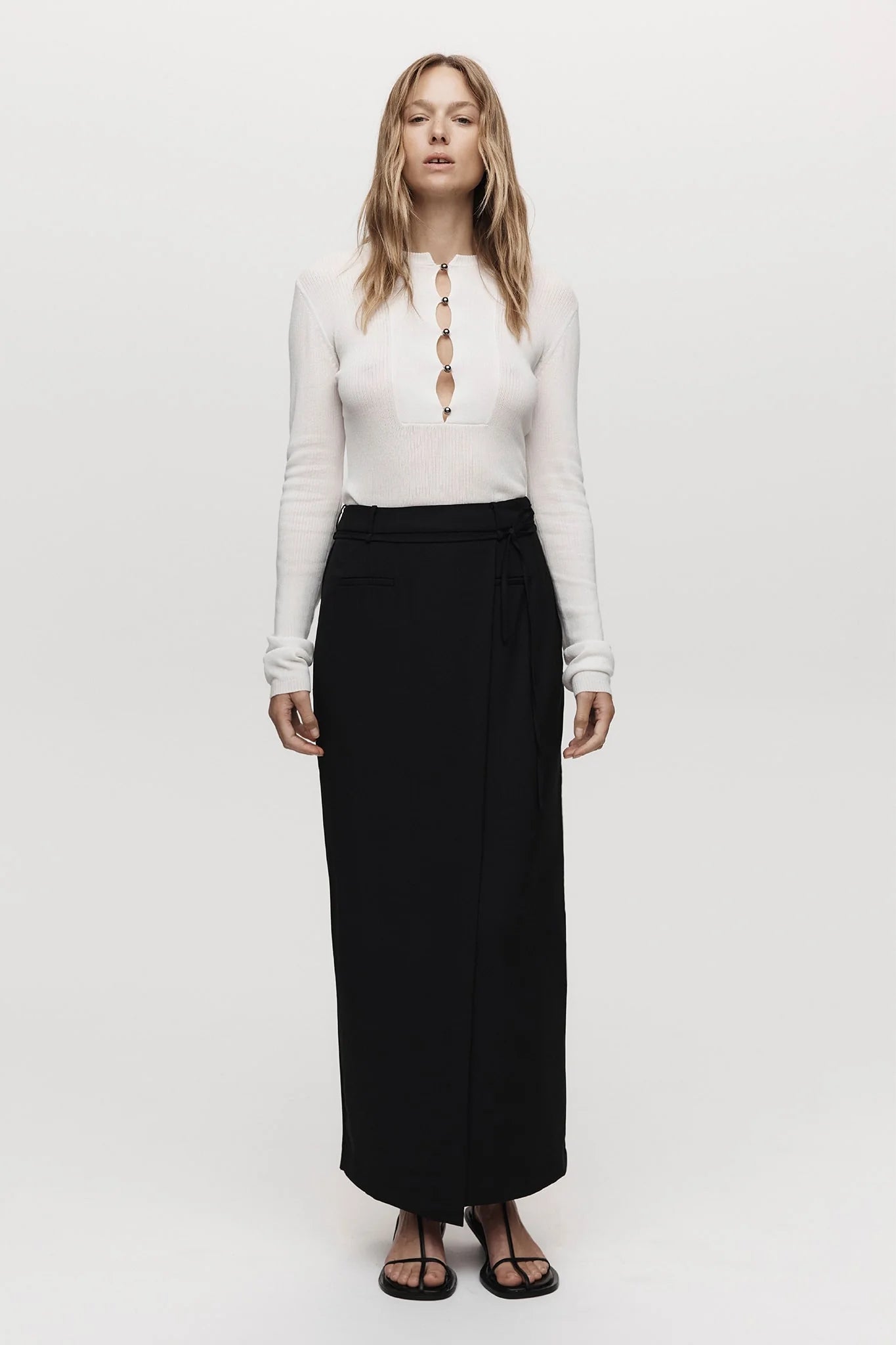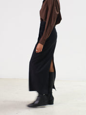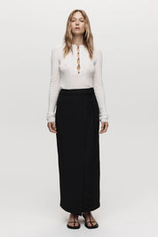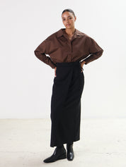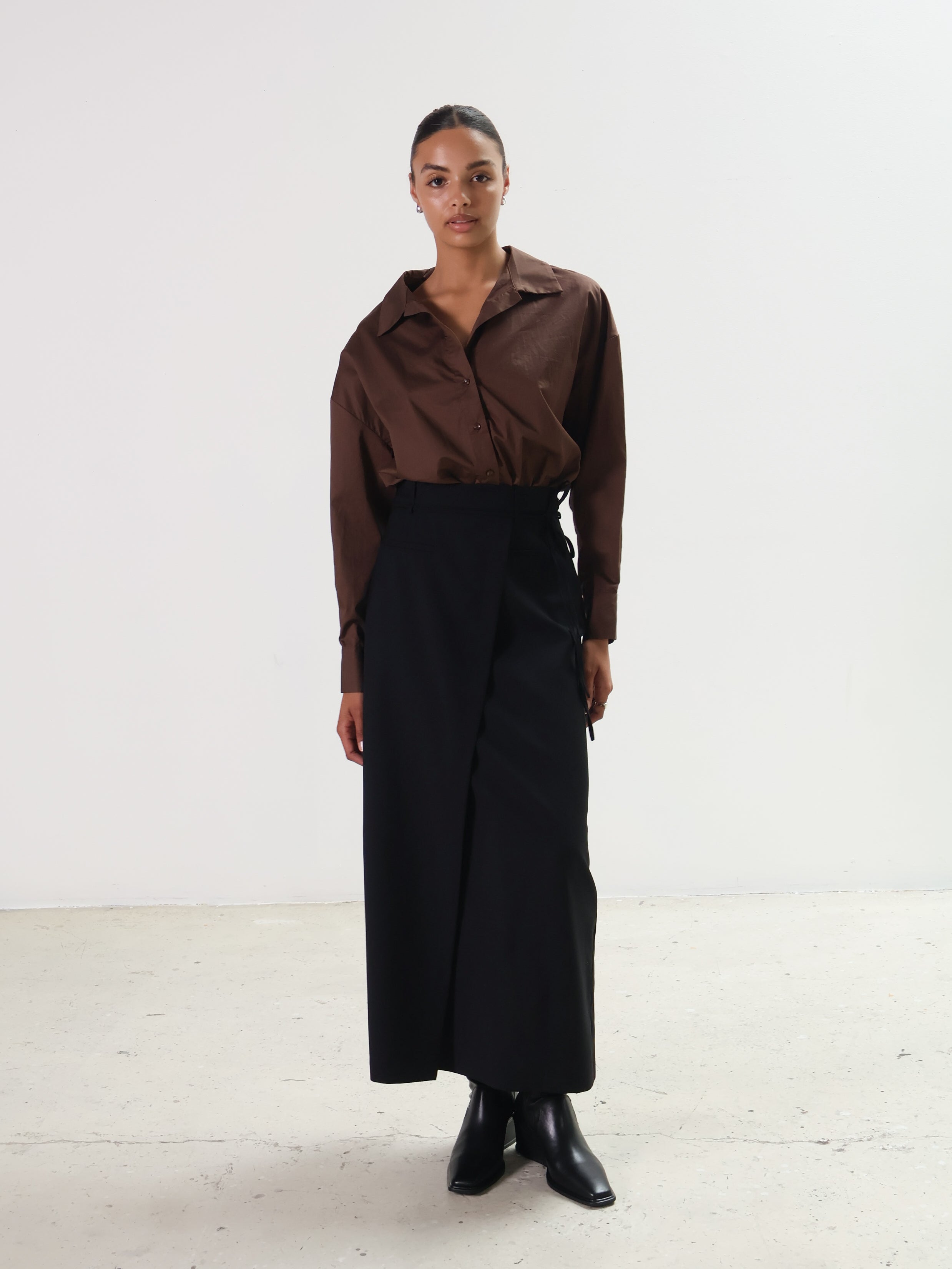 The Carmella Skirt is made from a lightweight 100% wool fabric. It features a full-length, wrap design with delicate tailoring touches, including belt loops and besom pockets at the front. The skirt sits on a fixed waistband and fastens with an invisible zip on the side. It also includes small loops at the waistband and a tie detail for added elegance.
