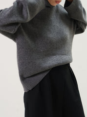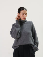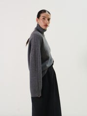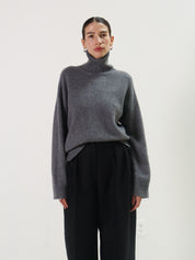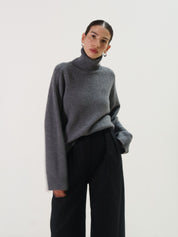 A grey turtleneck sweater by Rue Sophie in a super soft wool cashmere blend. Featuring a wide ribbed foldover neck and raglan-style seaming at the shoulder.