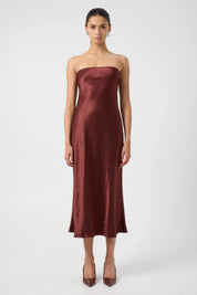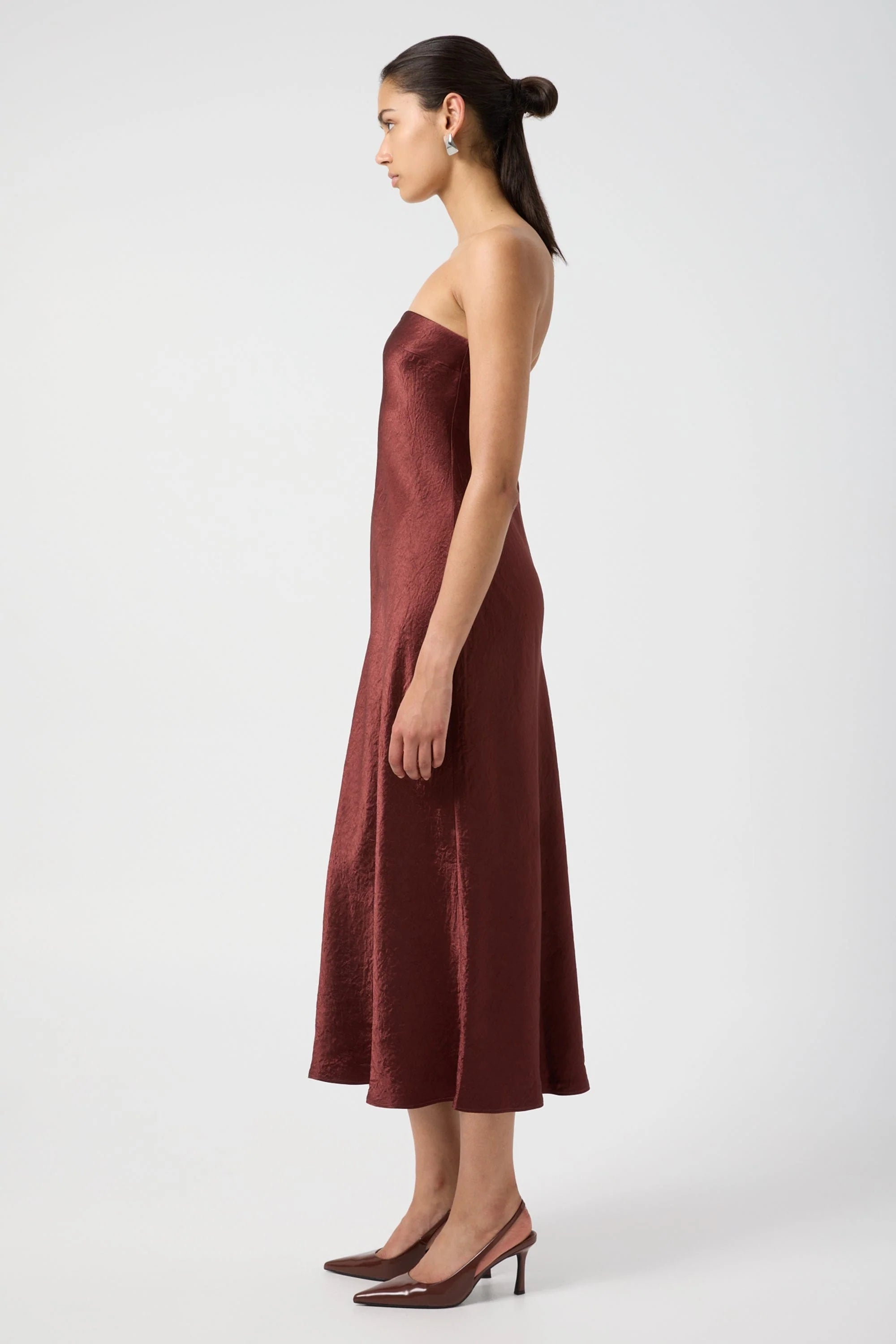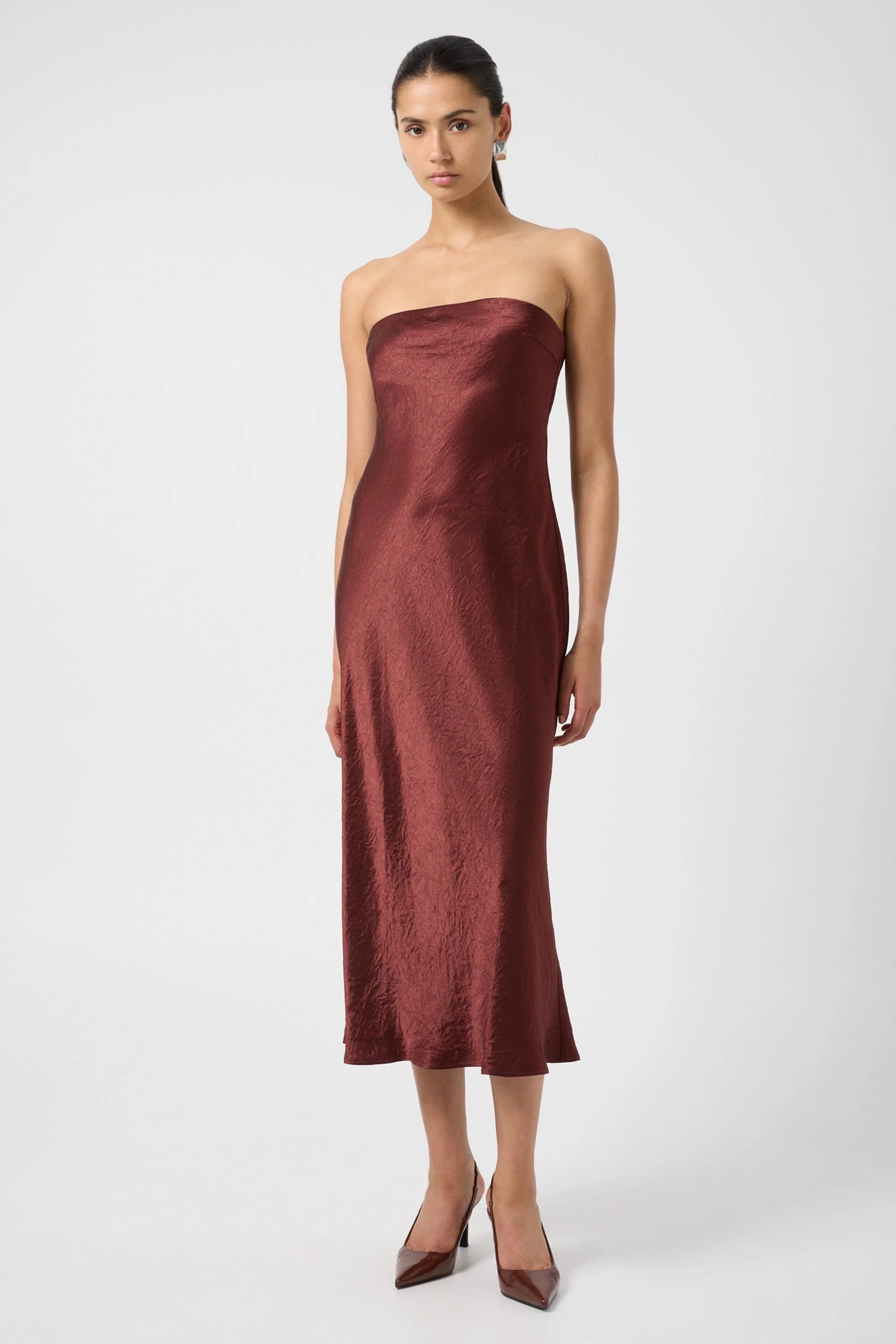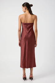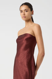The Crush Bias Strapless Dress defines refined elegance. With an alluring strapless silhouette, this dress is designed to gracefully skim the body and falls just above the ankles. This unique fabrication is sleek and luxurious to touch, whilst crafted from 100% sustainable Acetate. Slip on and wear, this is a strapless dress with the modern muse in mind.