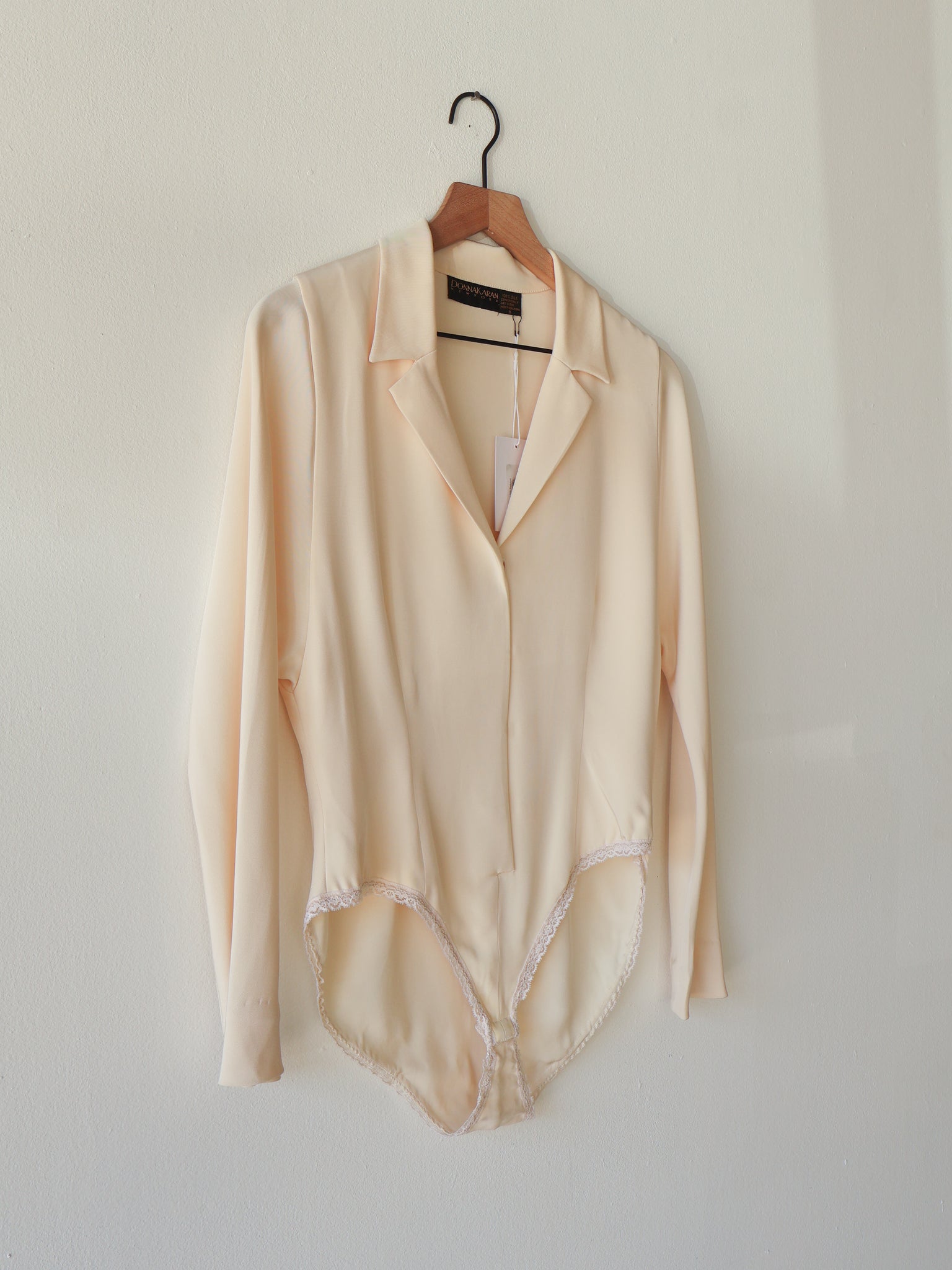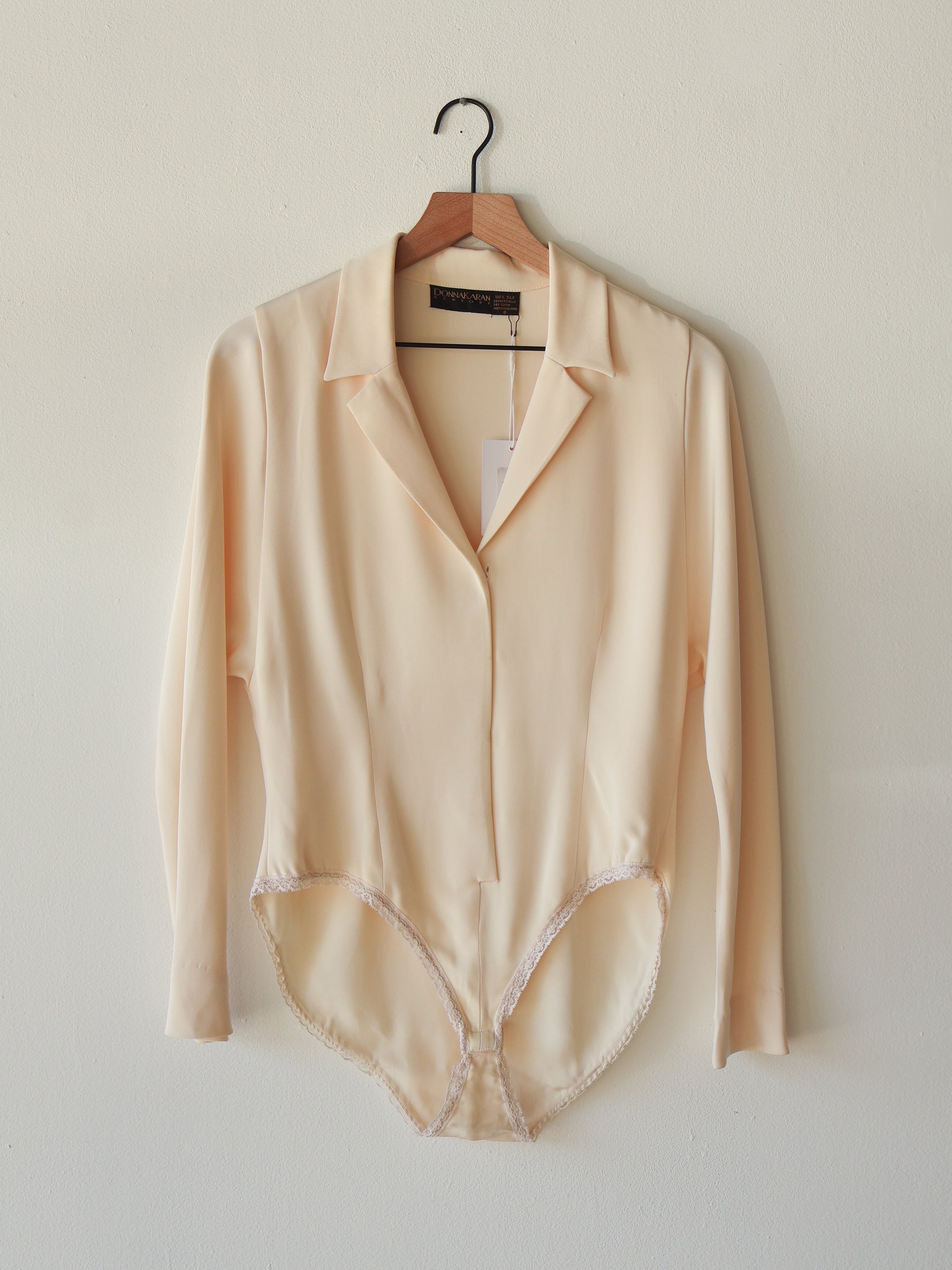 Gorgeous vintage Donna Karan cream silk bodysuit featuring a front covered placket closure. Donna Karan black label