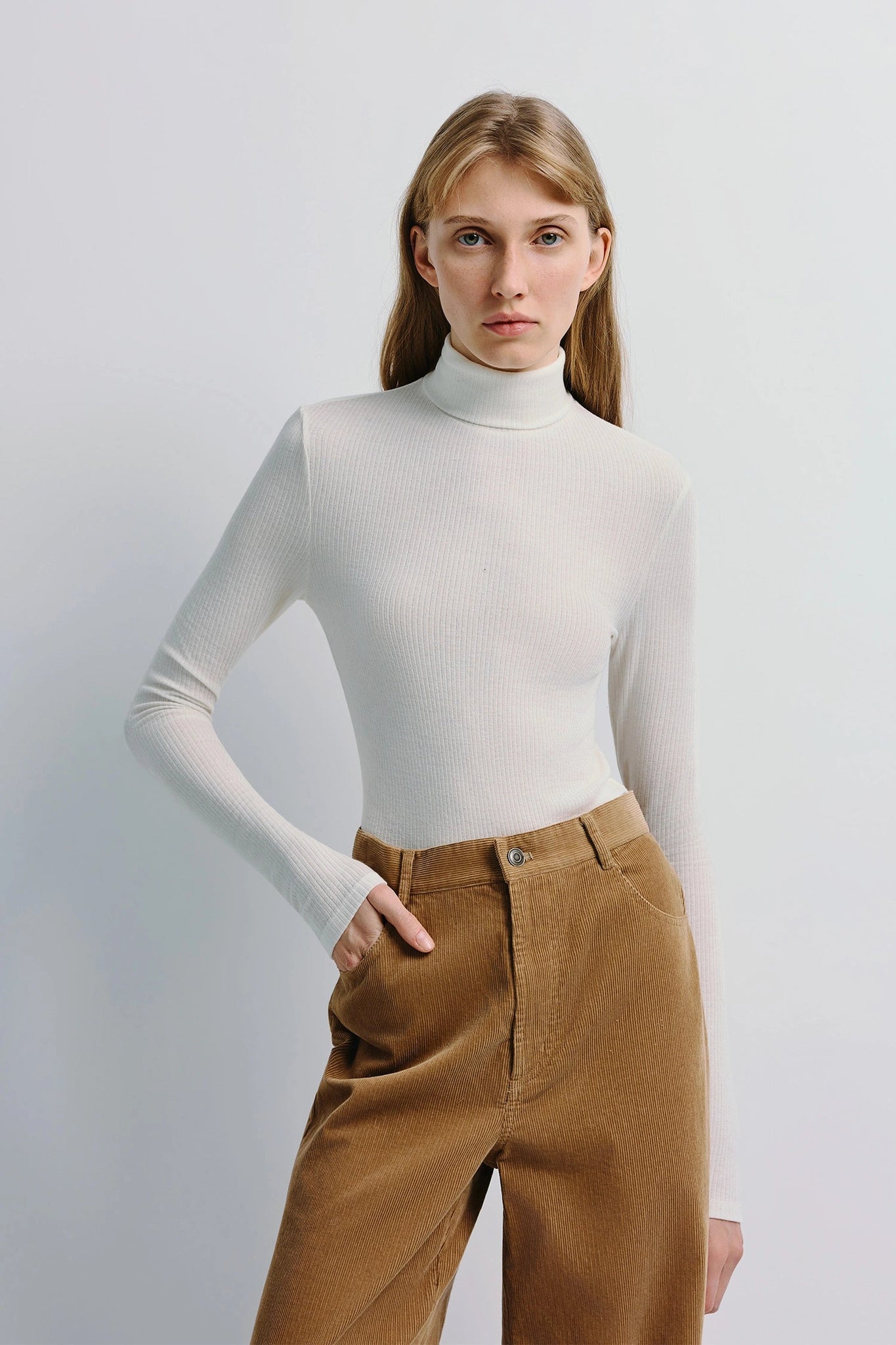 This slim, ribbed knit turtleneck top combines lyocell and wool for breathable warmth, making it ideal for refined, layered looks.