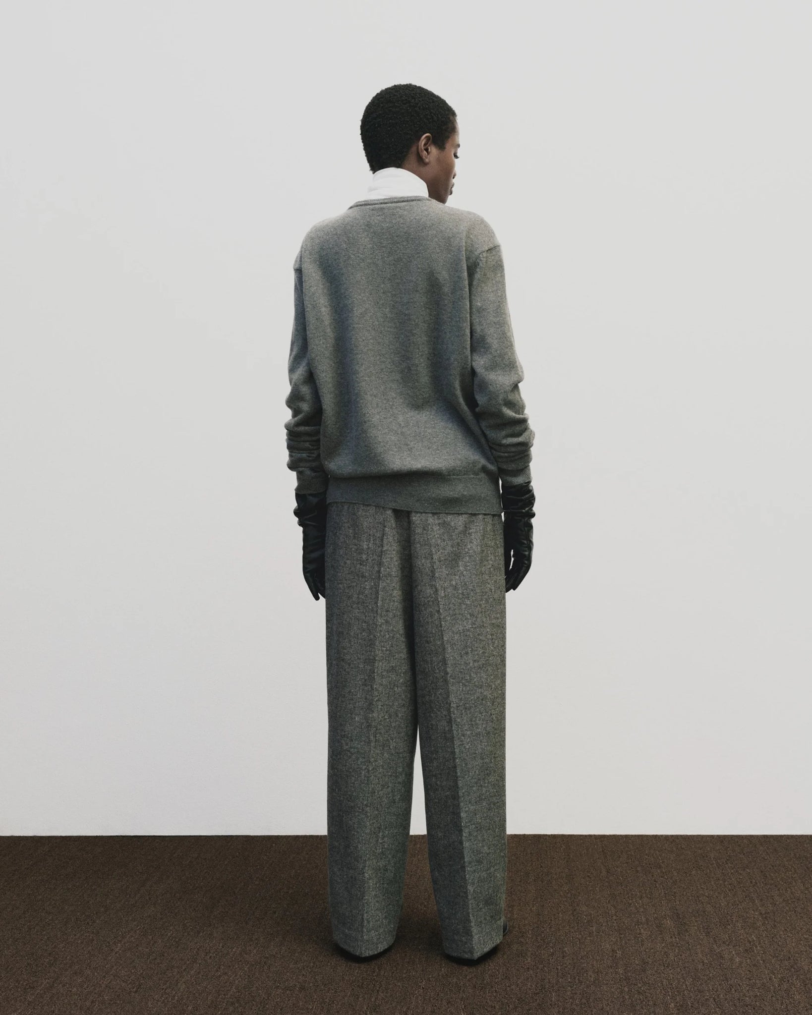These pants offer a relaxed fit with a mid-rise design for comfortable wear. Featuring a partially elasticated waistband and tasteful pleat detailing, they combine ease with subtle style. Pair with the Gray Wool Oversized  Blazer