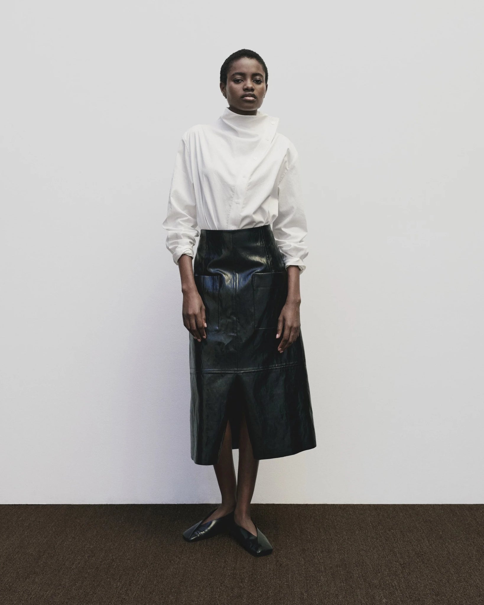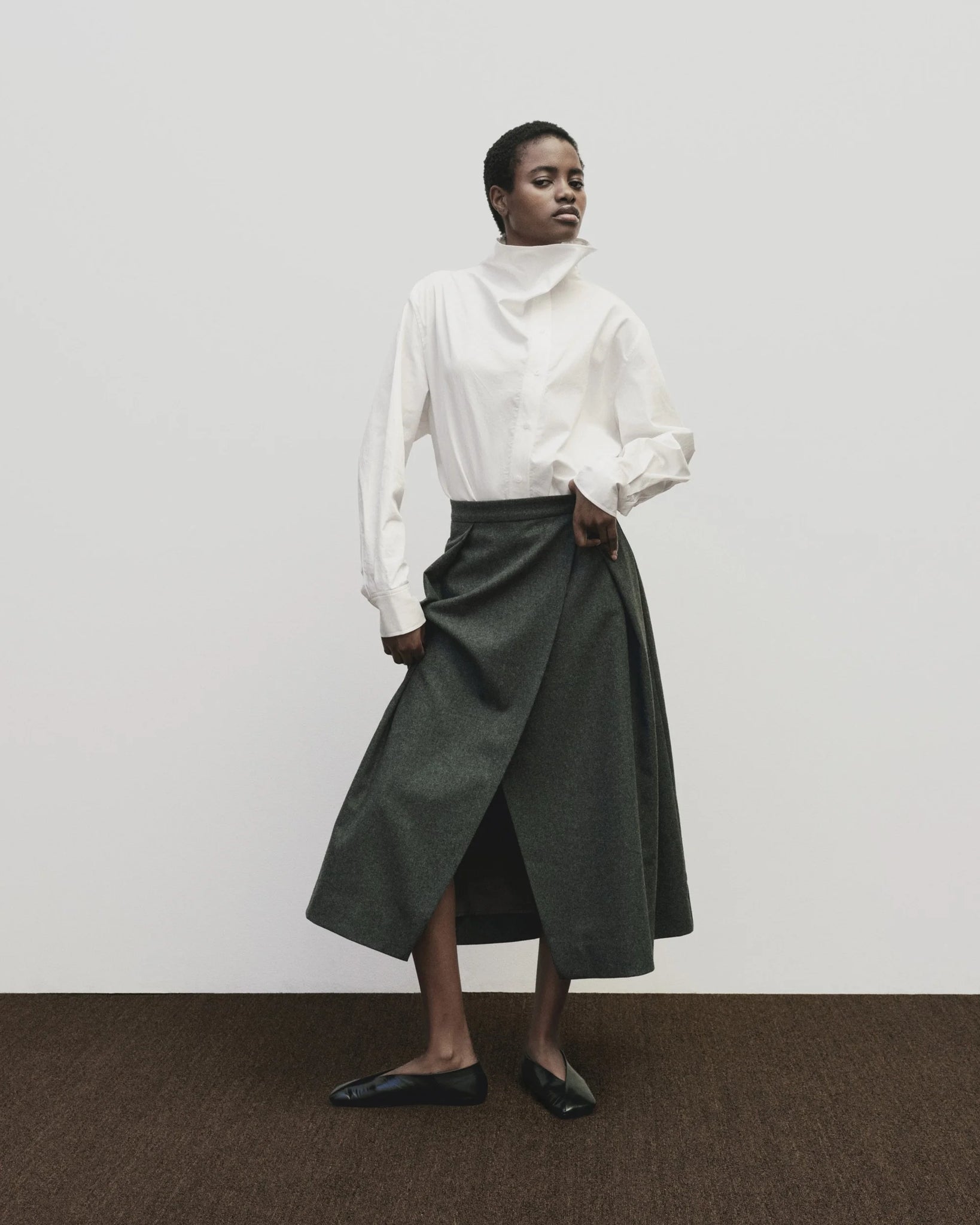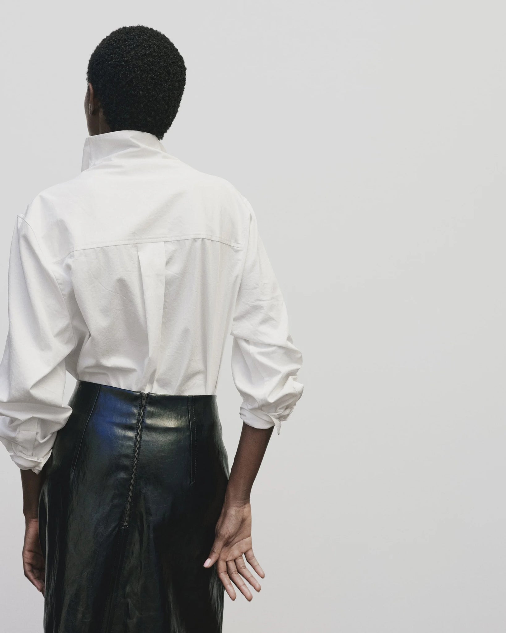This Mijeong Park white cotton shirt features a clean, asymmetrical button closure and a structured funnel neck. Its minimal design offers a subtle yet distinctive silhouette, perfect for a refined and modern wardrobe.
