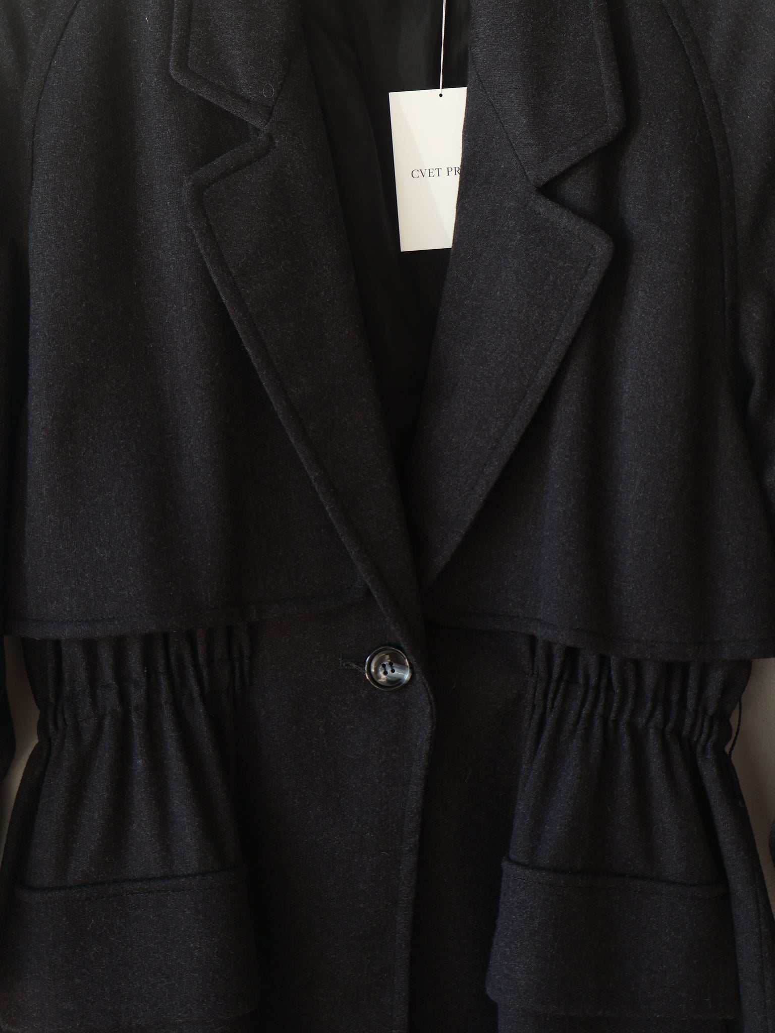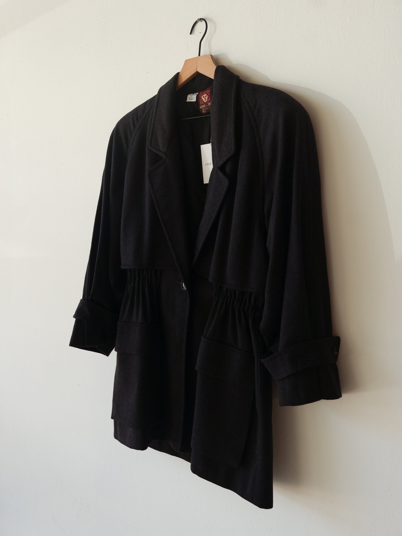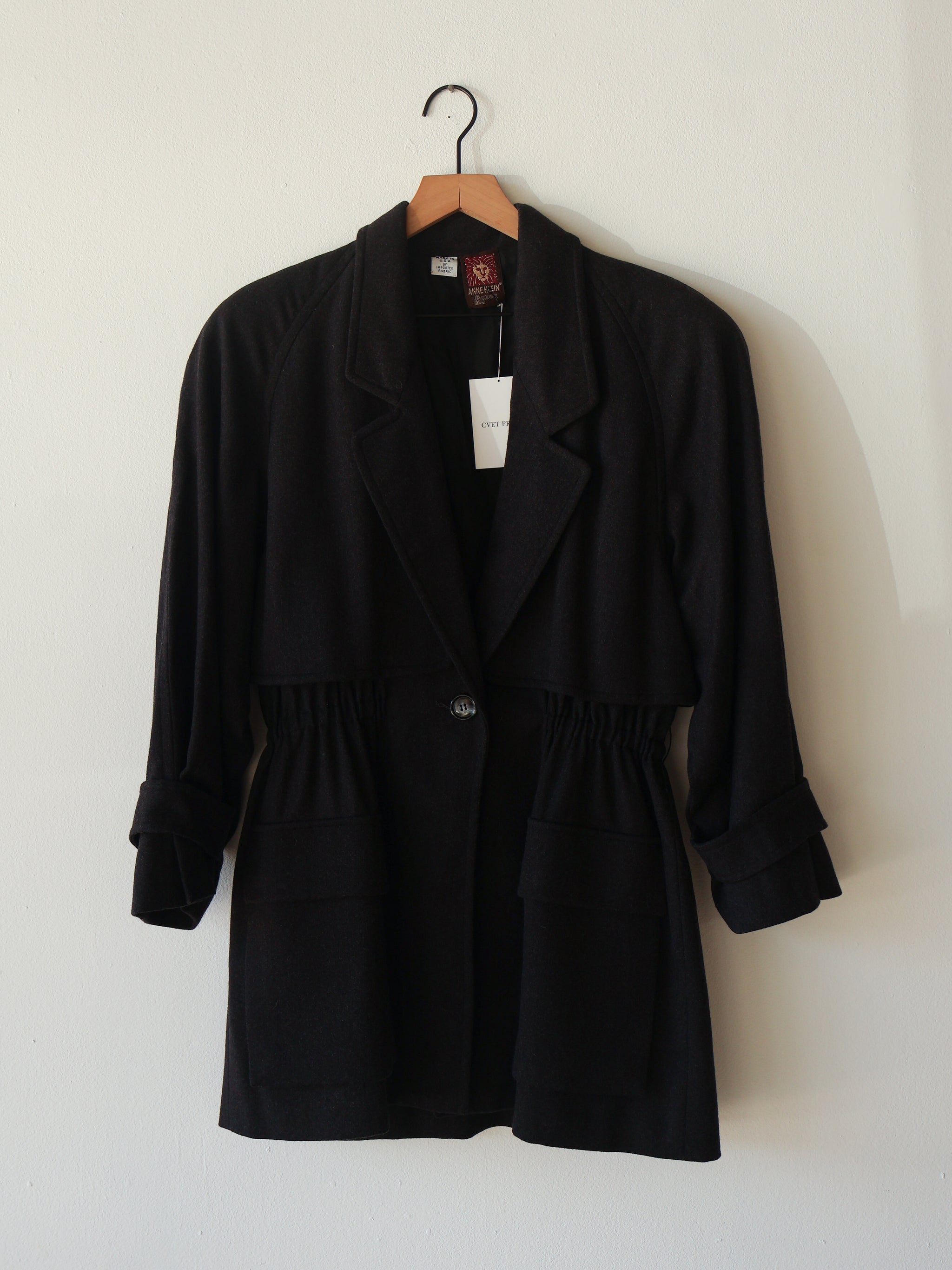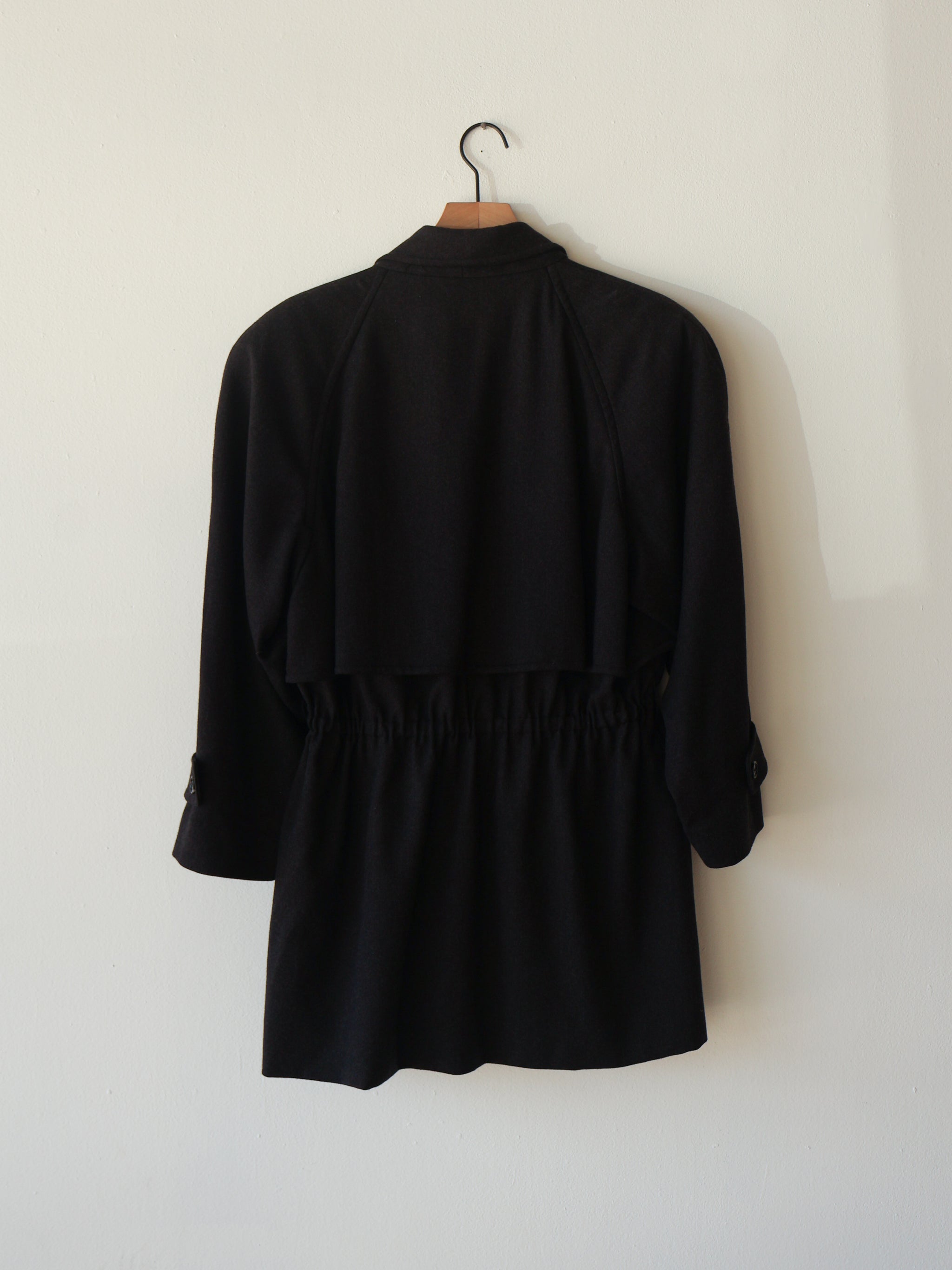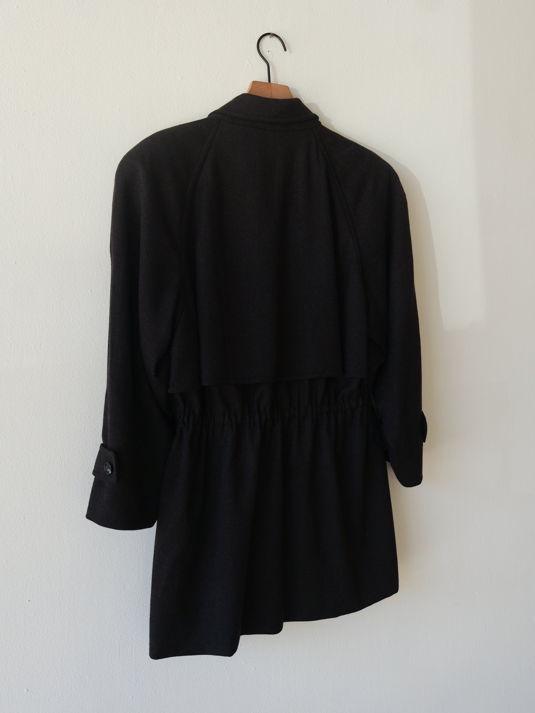A vintage Anne Klein wool cropped trench with a cinched elastic waist. Fully lined.