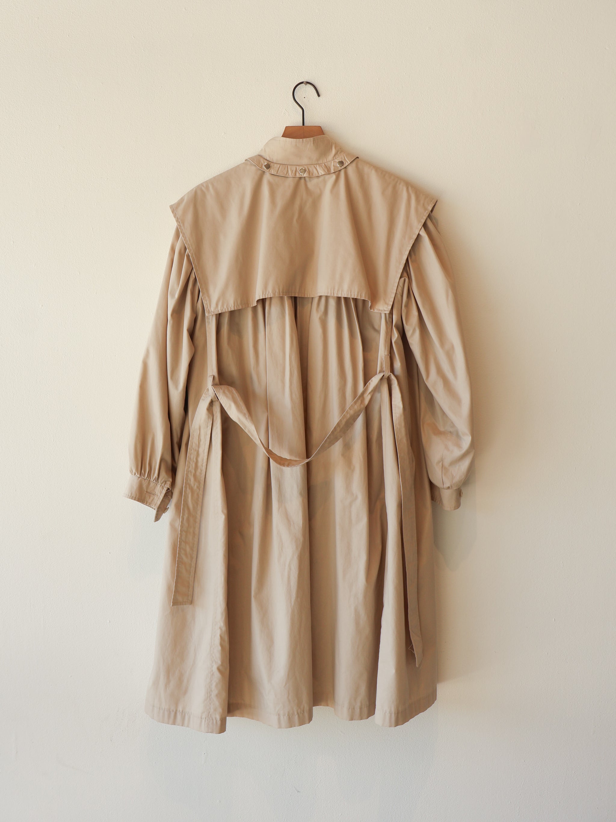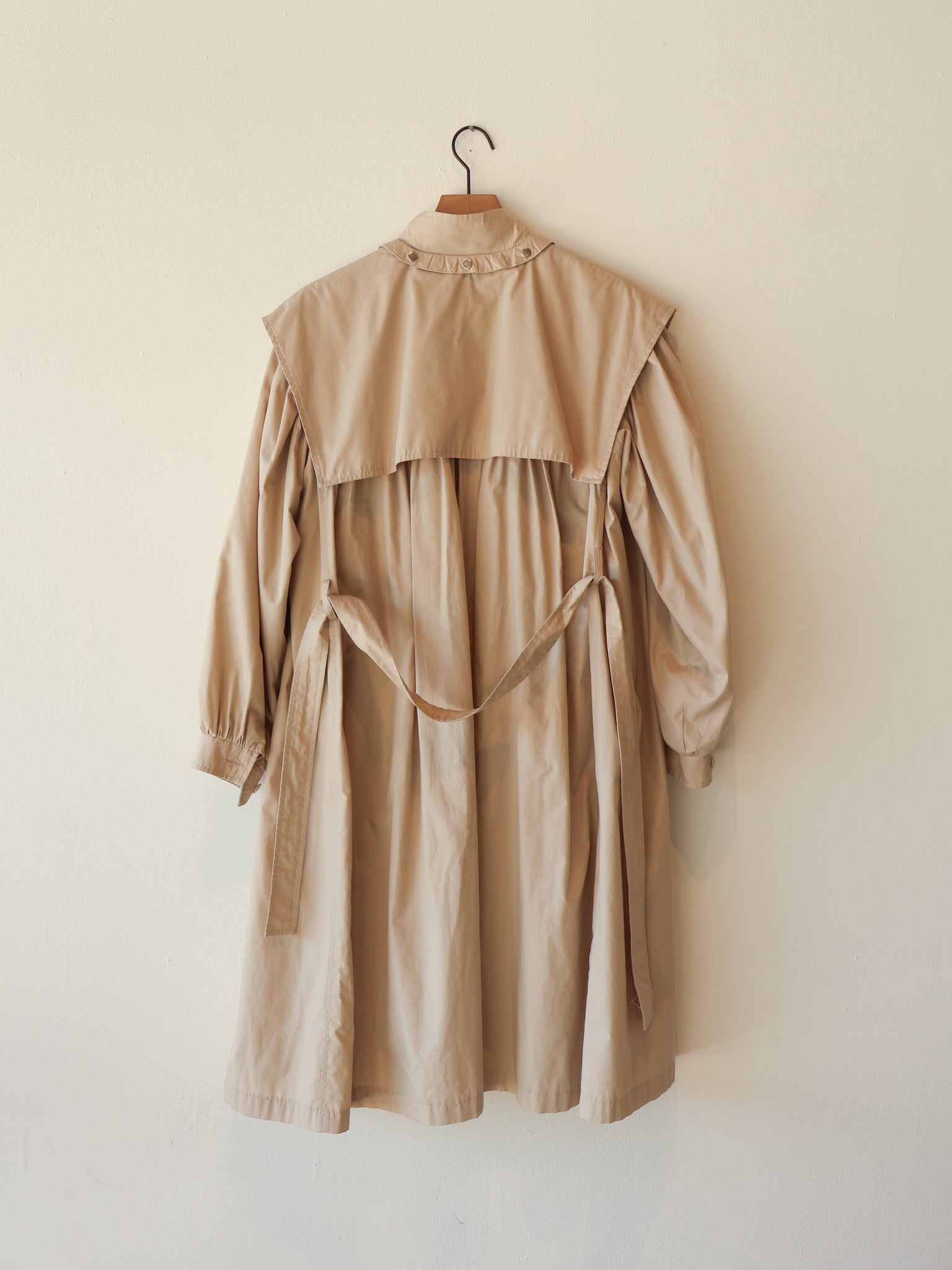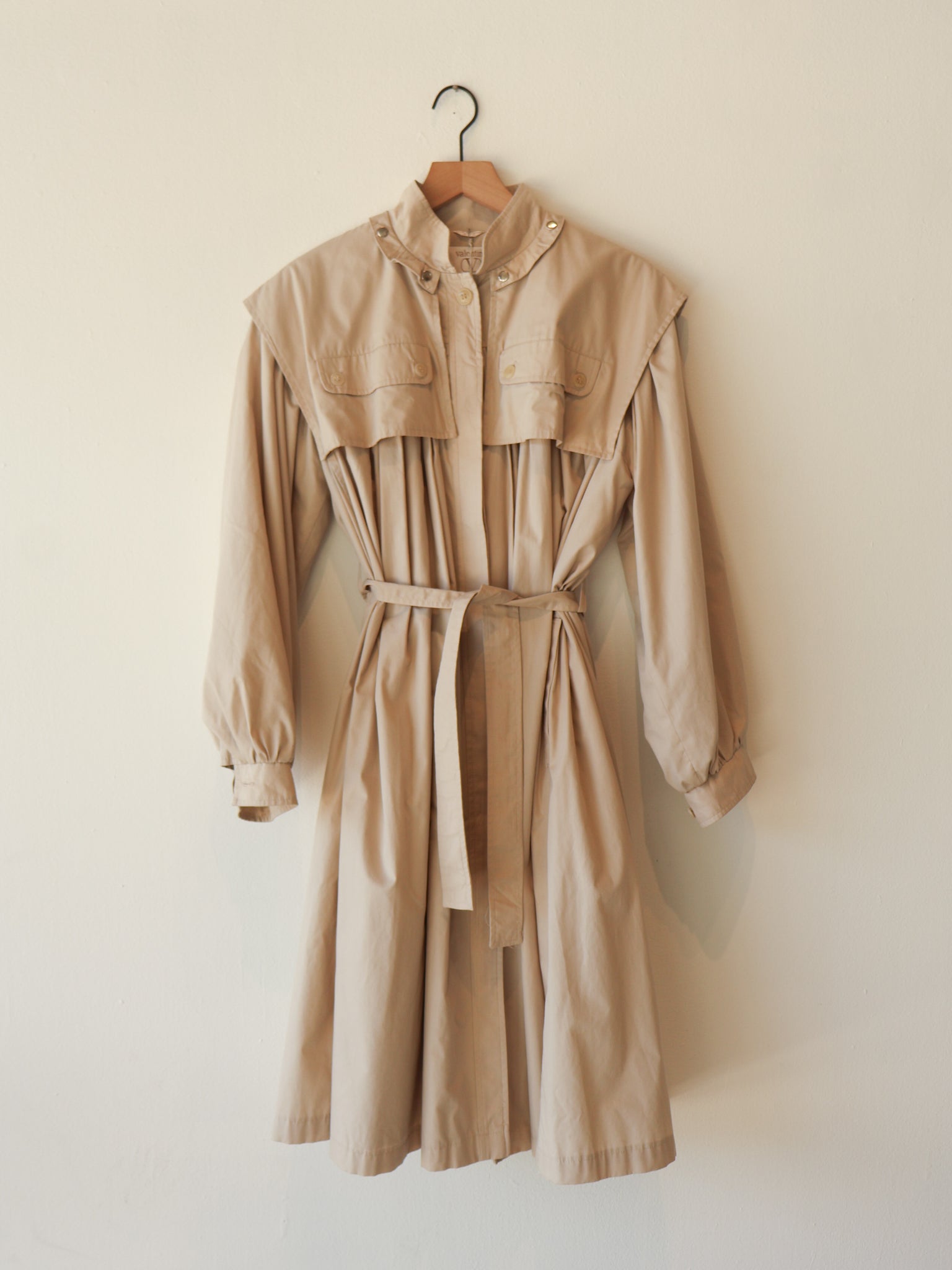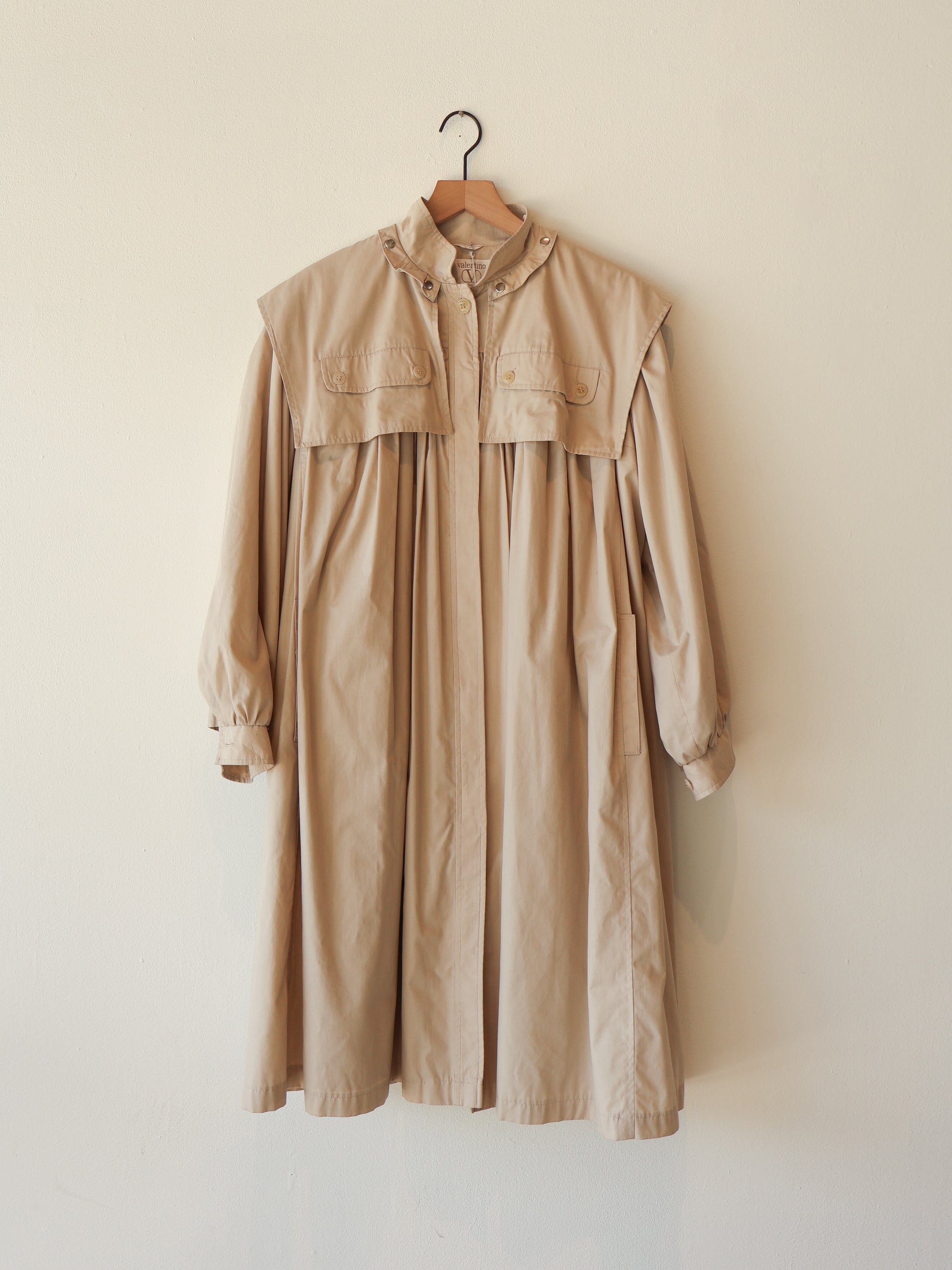 A stunning vintage Valentino ecru rain trench, gathered for a dramatic sweeping shape. Fully lined and featuring utilitarian pockets and detailing.